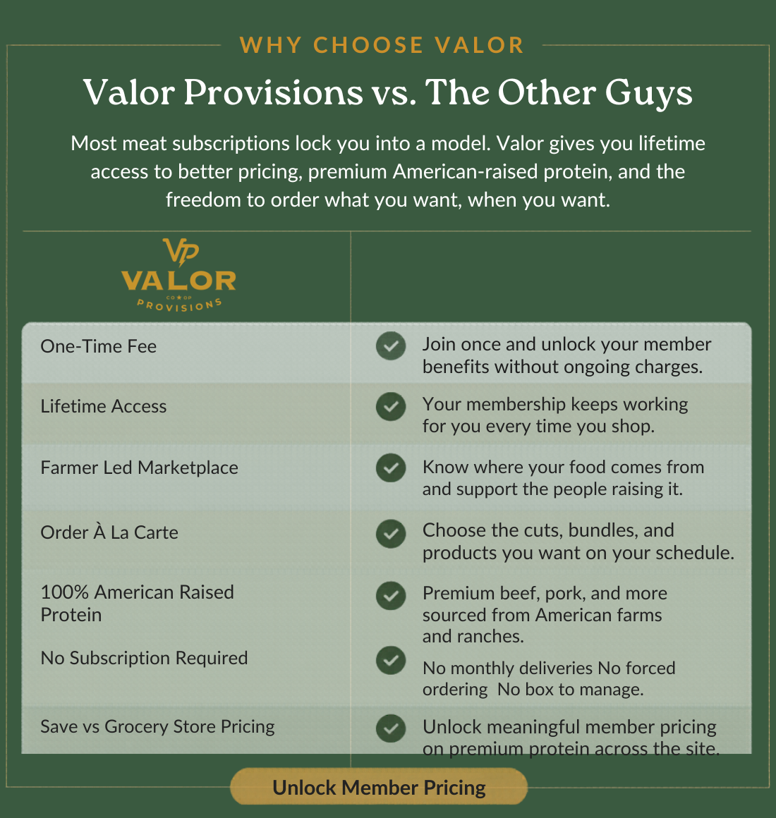Members unlock exclusive pricing across the site on premium American raised protein. Savings vary by product, and the membership is designed to pay for itself over time through member only pricing and exclusive access.